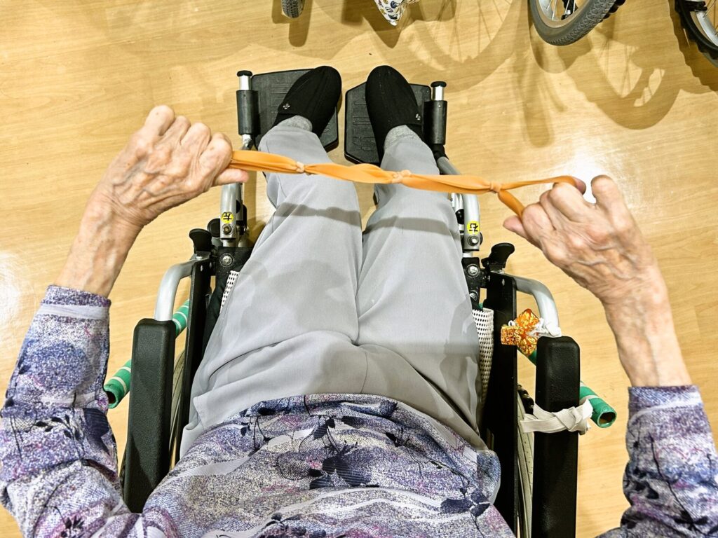 今日はゴム紐も使って全身運動をしていただきました。