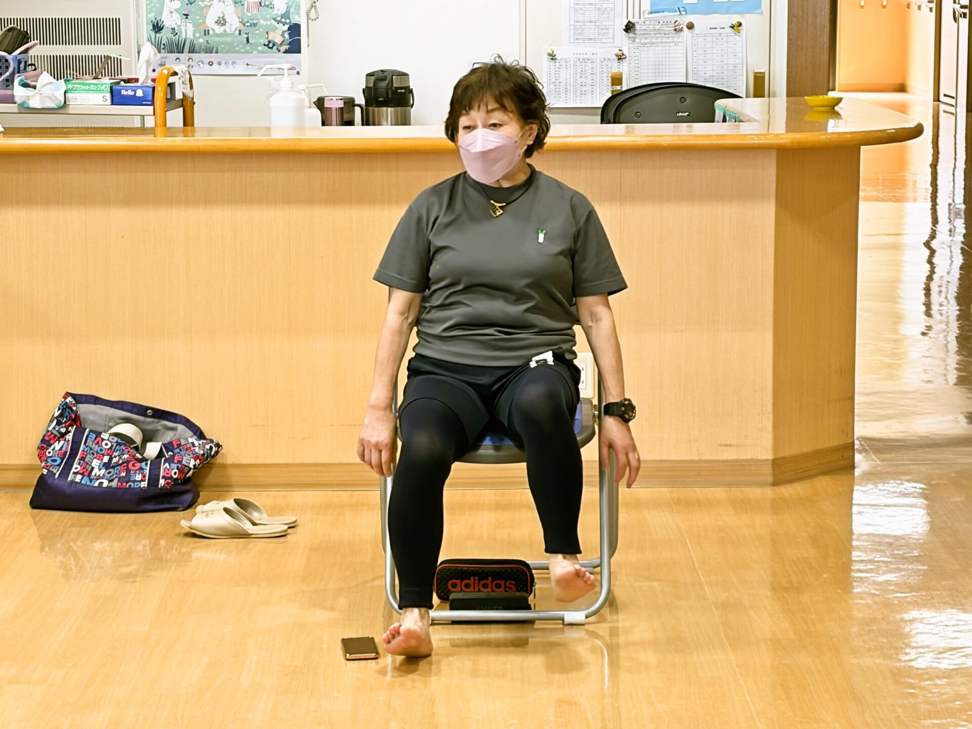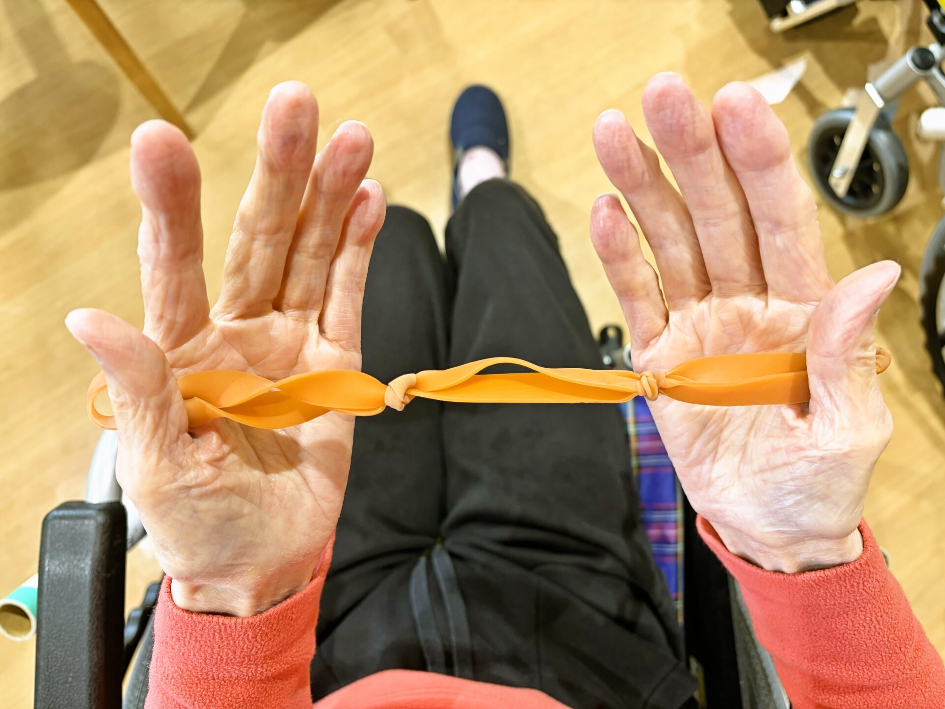 今日はゴム紐も使って全身運動をしていただきました。